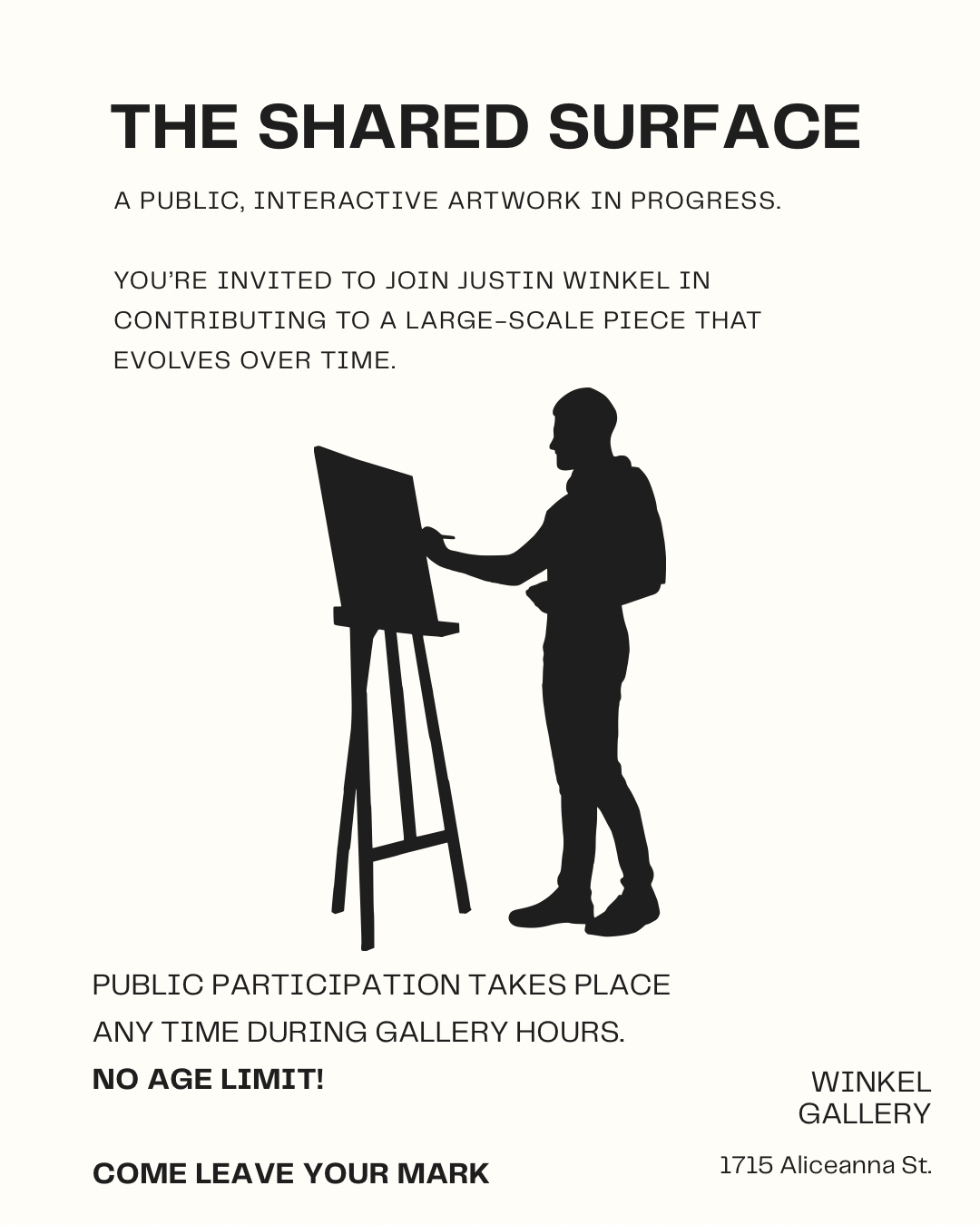 The second is an interactive project titled THE SHARED SURFACE—a public, evolving artwork. I’ve installed 10 foot wide, a floor-to-ceiling, sheet of paper and will work on it daily while in the gallery. Visitors are invited to contribute their own marks, adding to the piece in real time. The goal is to encourage public creativity and simply just play and be part of this experience.