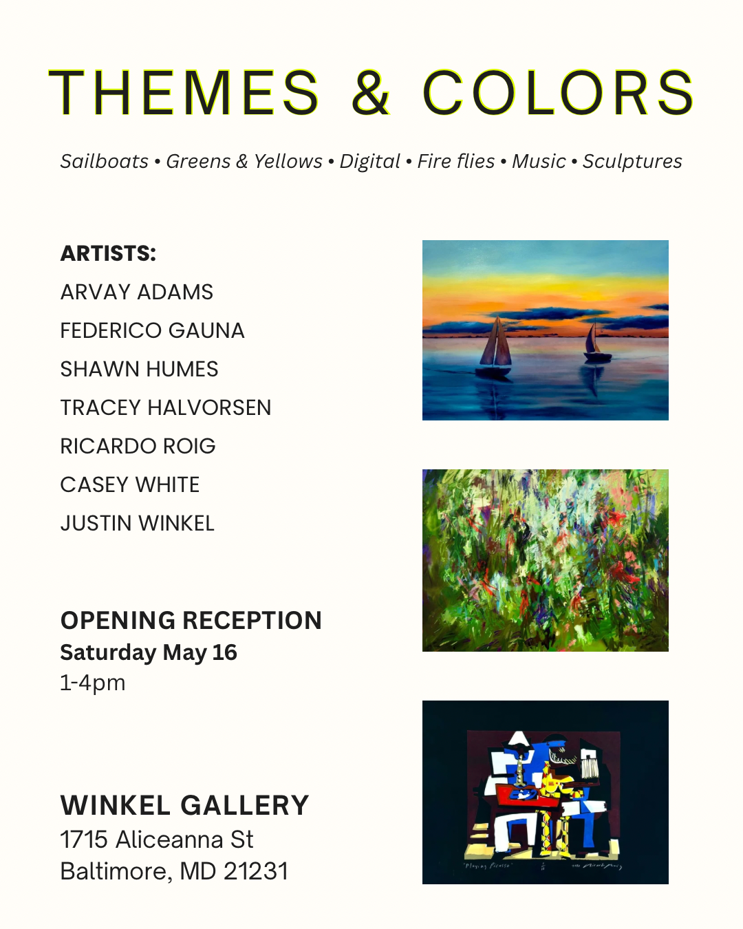 Themes & Colors invites viewers to look beyond surface similarities and engage with nuance—exploring not just what is depicted, but how each artist transforms theme and color into a personal visual language.