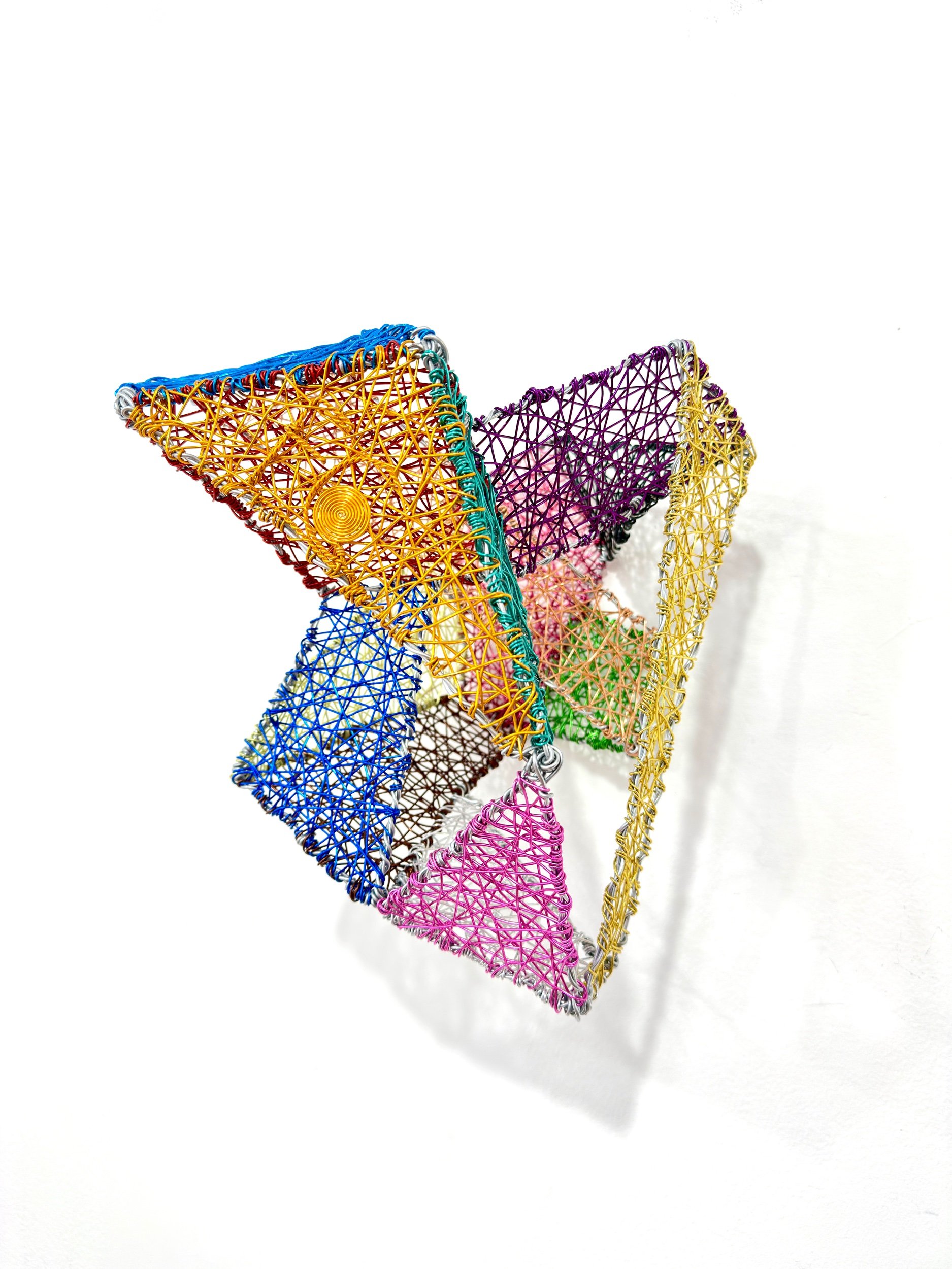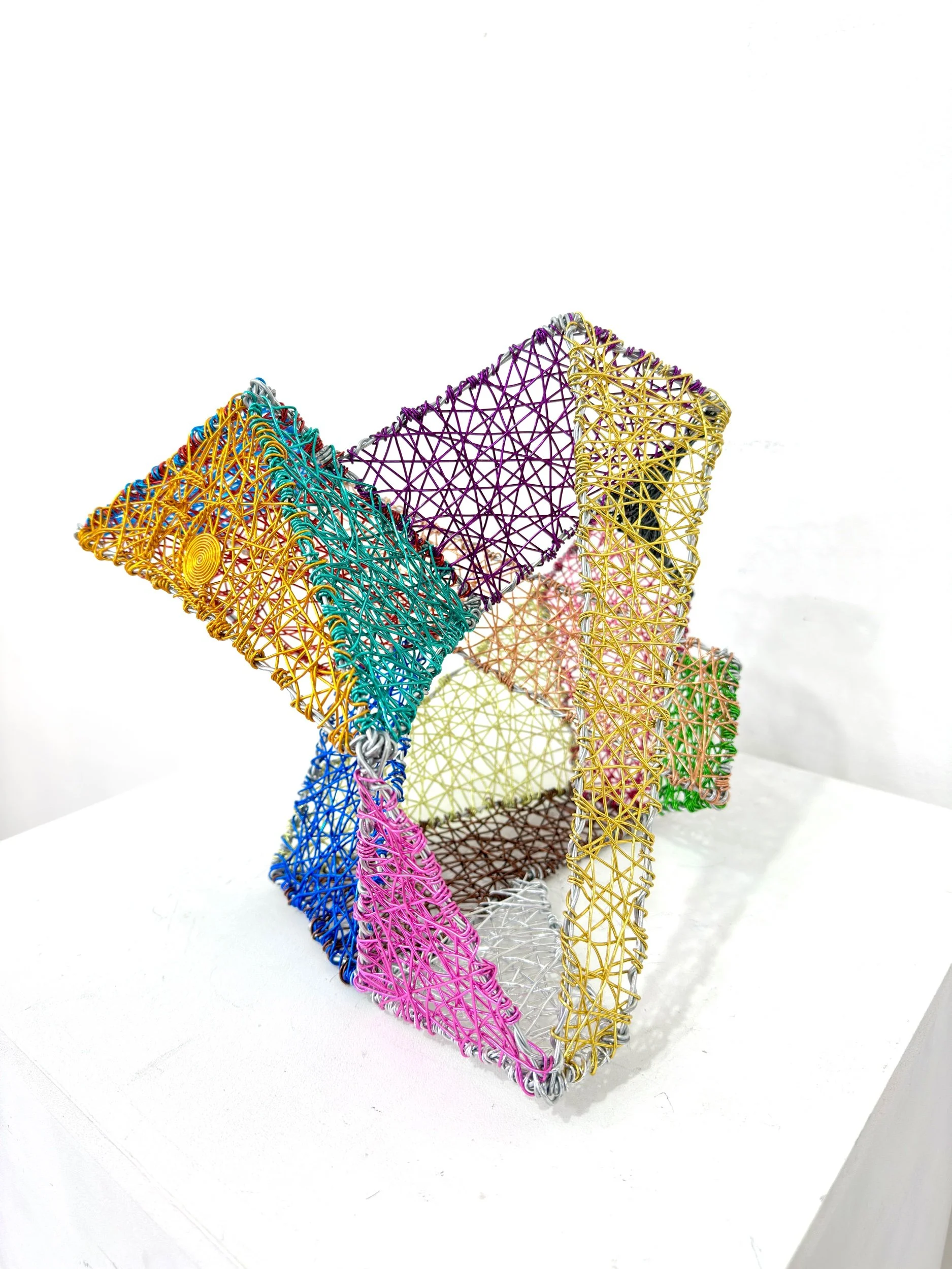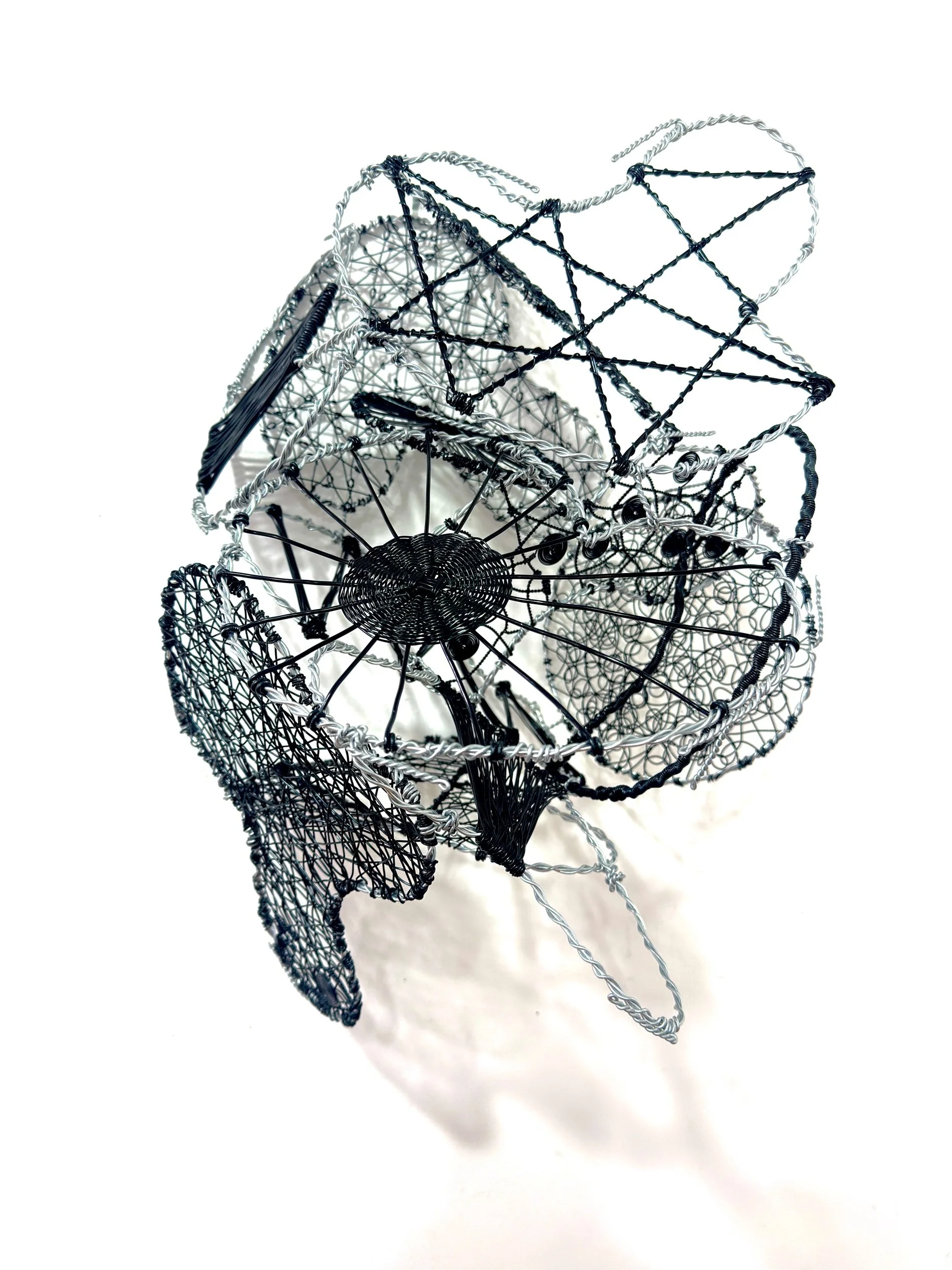 This sculpture can be suspended from a ceiling, hung on a wall, or placed on a table or pedestal