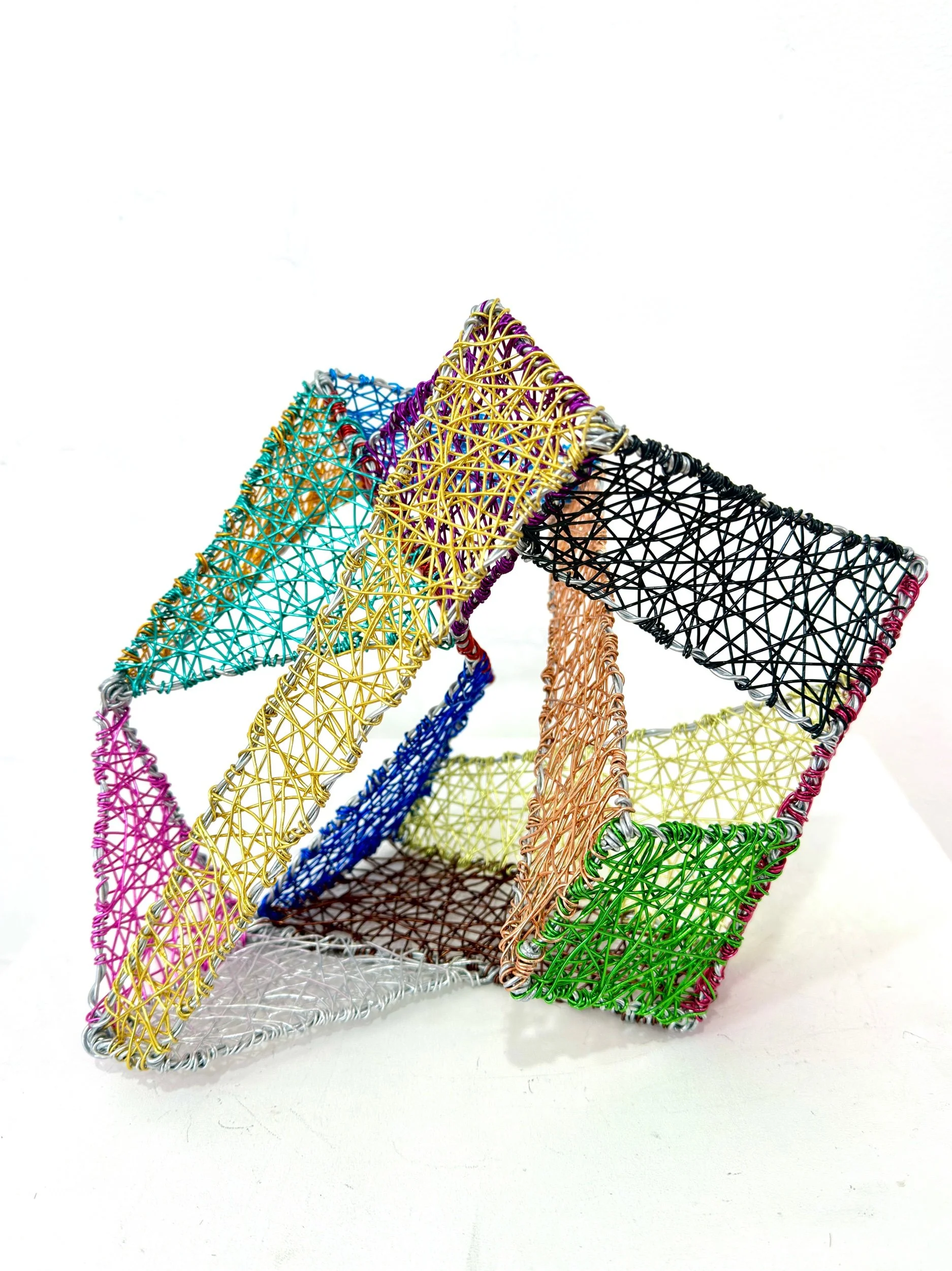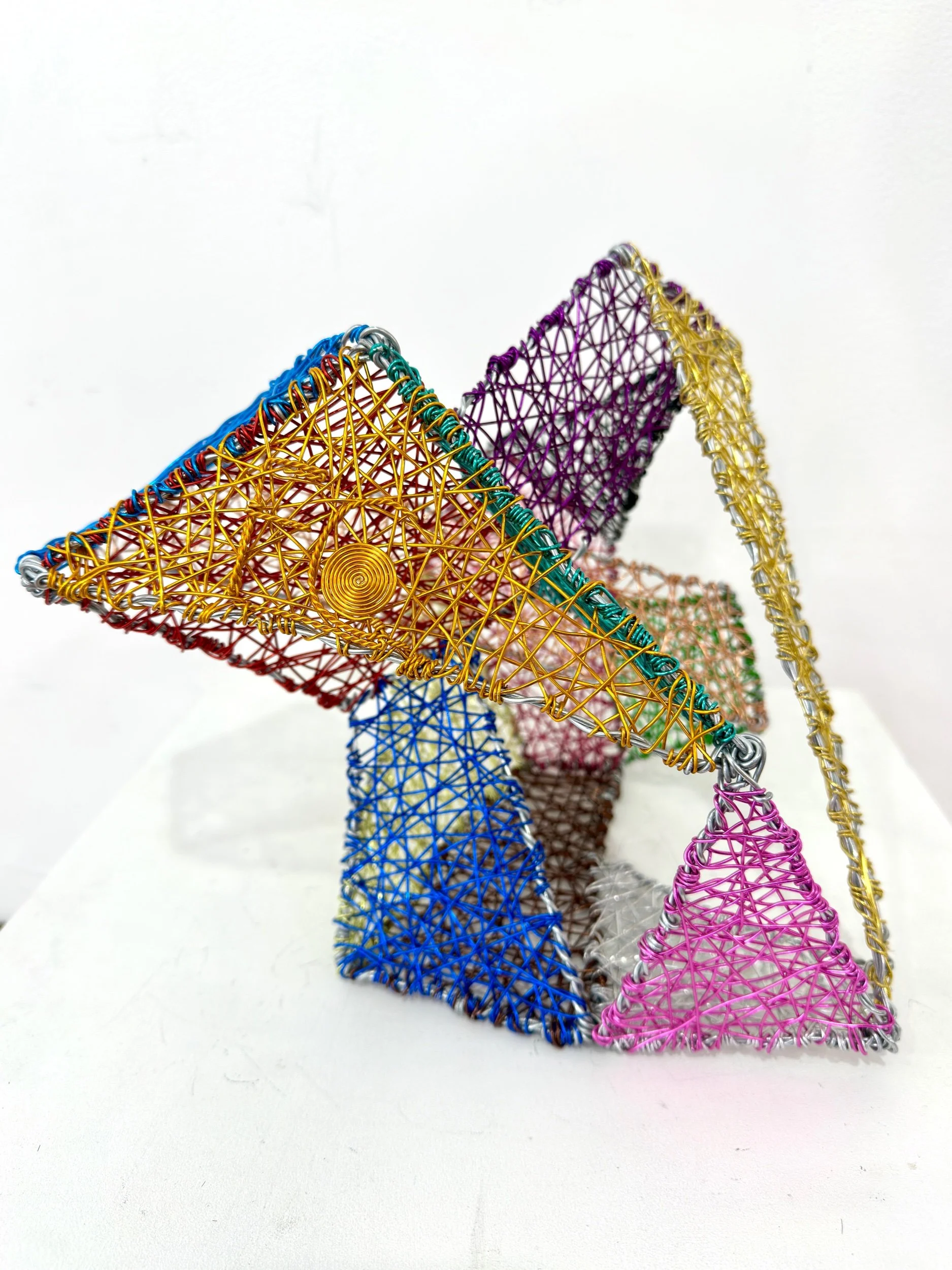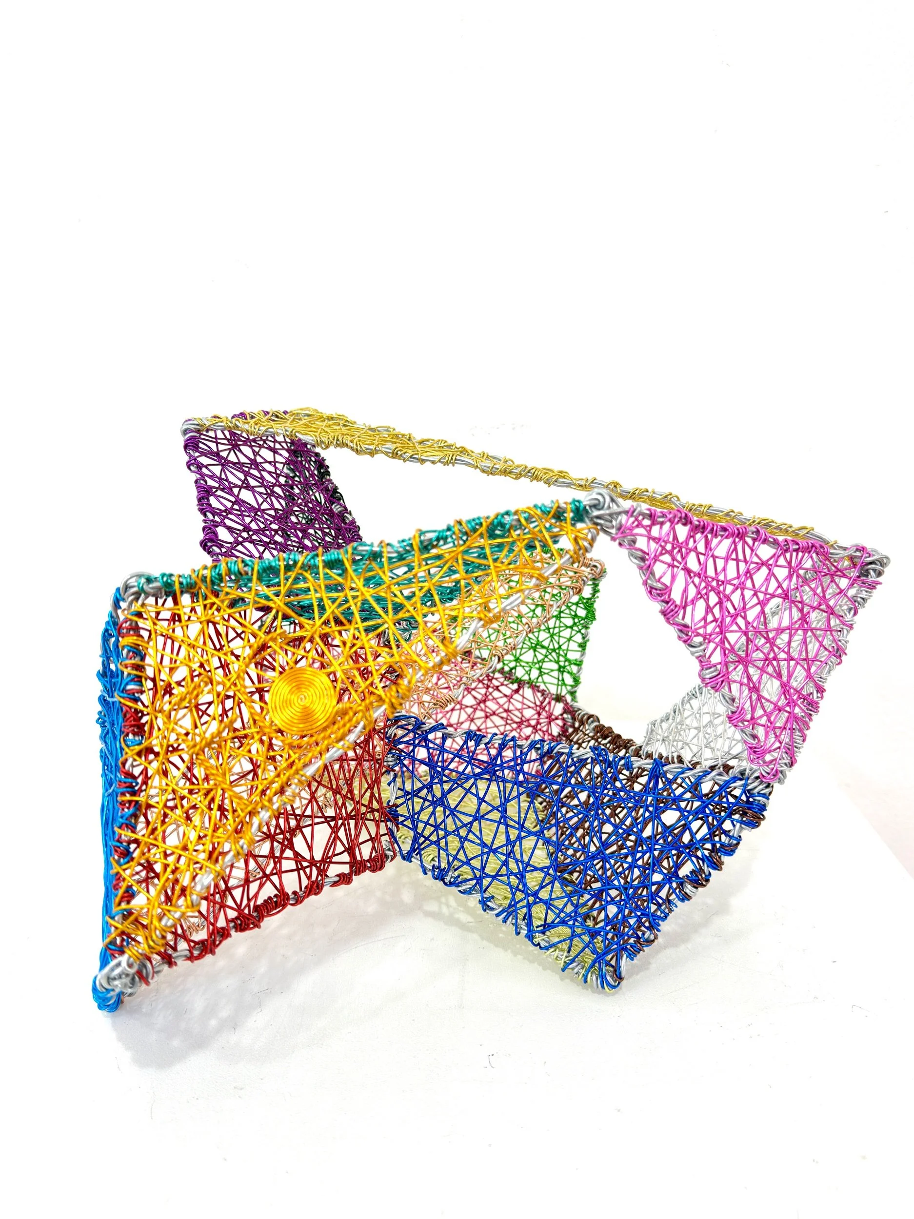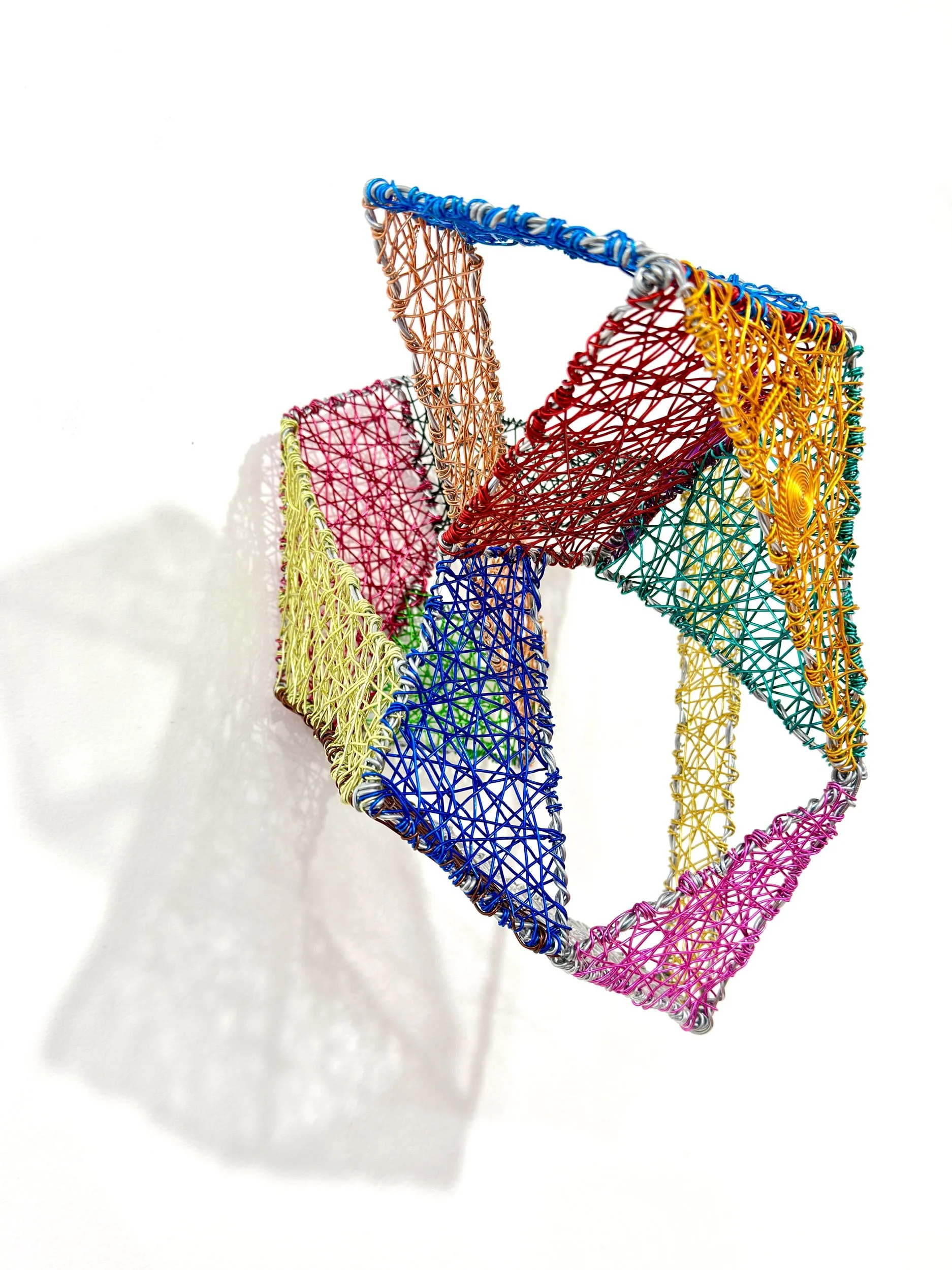 This sculpture can be suspended from a ceiling, hung on a wall, or placed on a table or pedestal